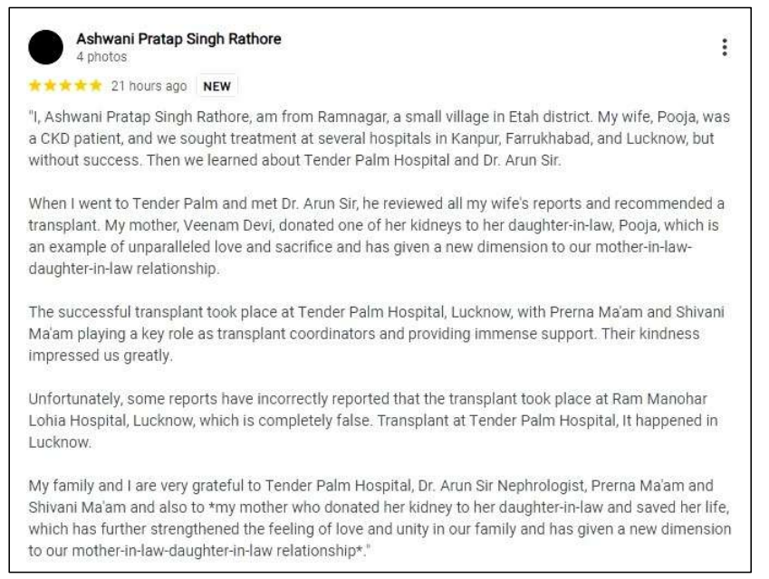 On 13 September 2025, our expert transplant team, led by Dr. Arun Kumar (Director – Nephrology), and Dr. Feroz Moh. Khan (Transplant Surgeon) successfully performed the surgery. Today, Pooja is recovering well under close medical supervision and looks forward to a healthy future with her baby and family.